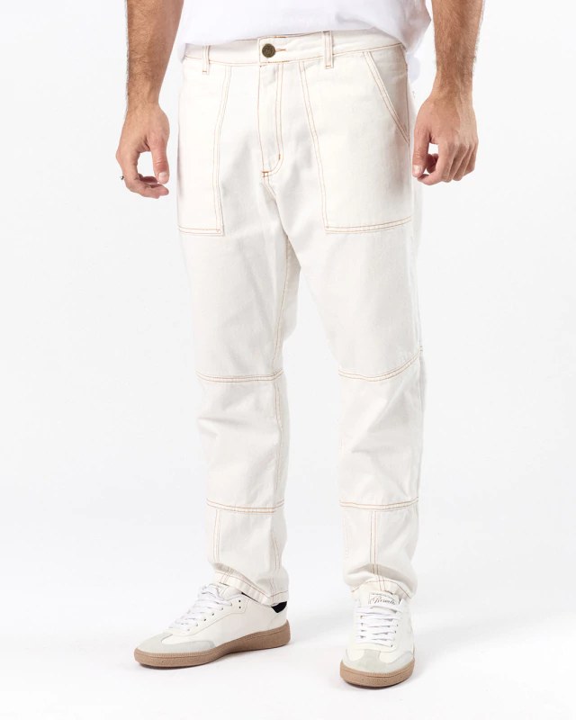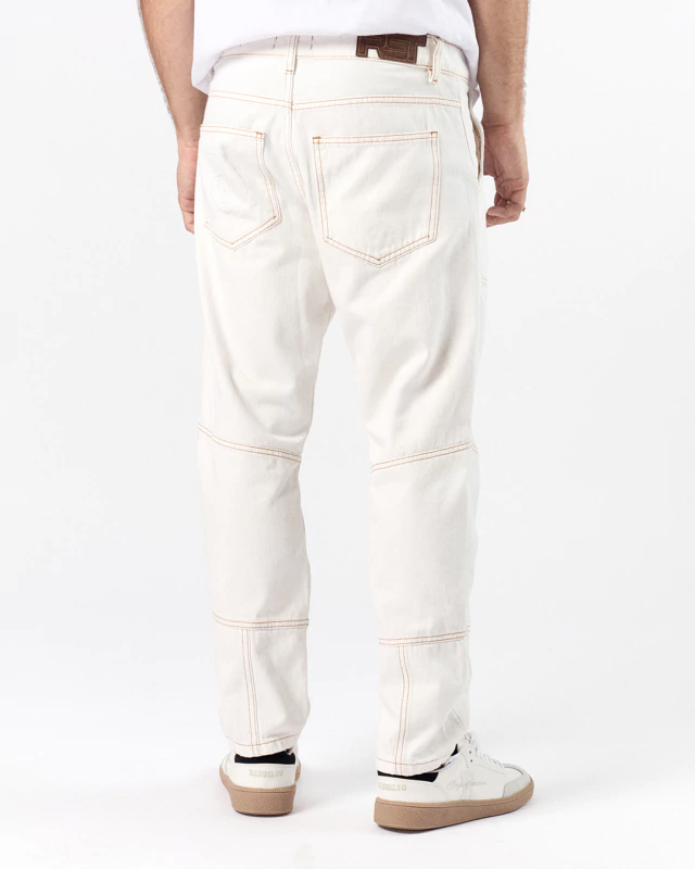 Jean color off white construido con un denim 100% algodón, con recortes a lo largo de la prenda confeccionados con costuras color ocre que diferencian a esta prenda. Cuenta con la impronta de nuestros jeans, su bordado de nuestro isologo en bolsillo trasero, y badana en JL.