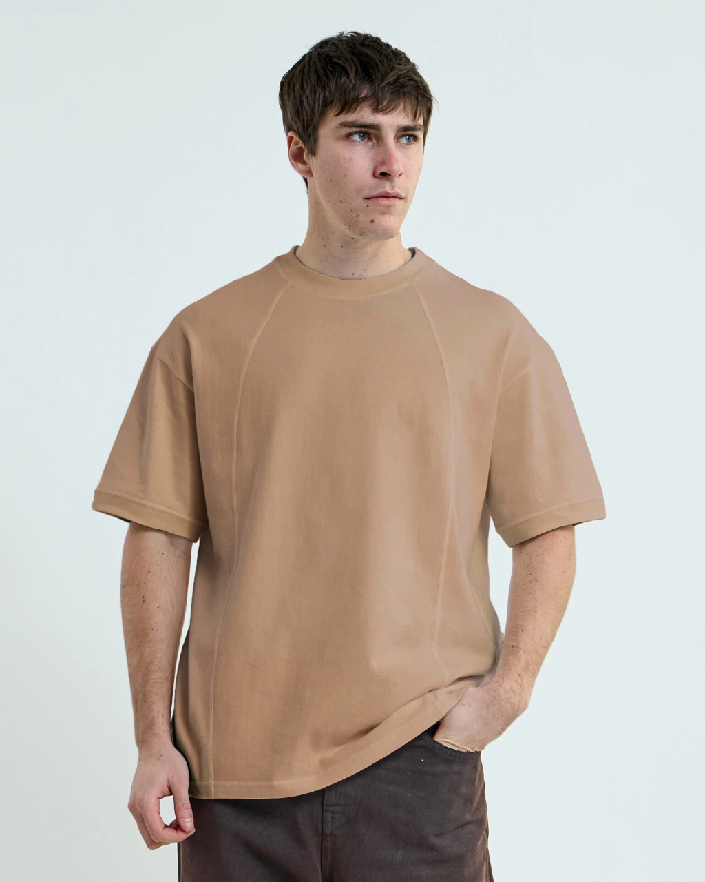 Remera lisa de corte oversize, con moldería compleja y recorte, confeccionada en jersey 100% algodón sanforizado (anti-encogimiento) . Cuello en ribb y costuras reforzadas.